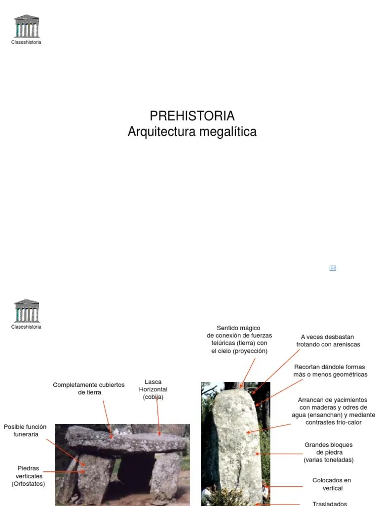 Se denomina a los primeros hitos conservados de la incipiente arquitectura. 4 características de la arquitectura megalítica. Constan de enormes losas pétreas sin tallar, o escasamente desbastadas. Se distribuye por gran parte de europa occidental:. La arquitectura prehistórica se entiende como un medio de expresión y construcción primitivo que empezó a generar pensamientos de creencias sobre las culturas primitivas.